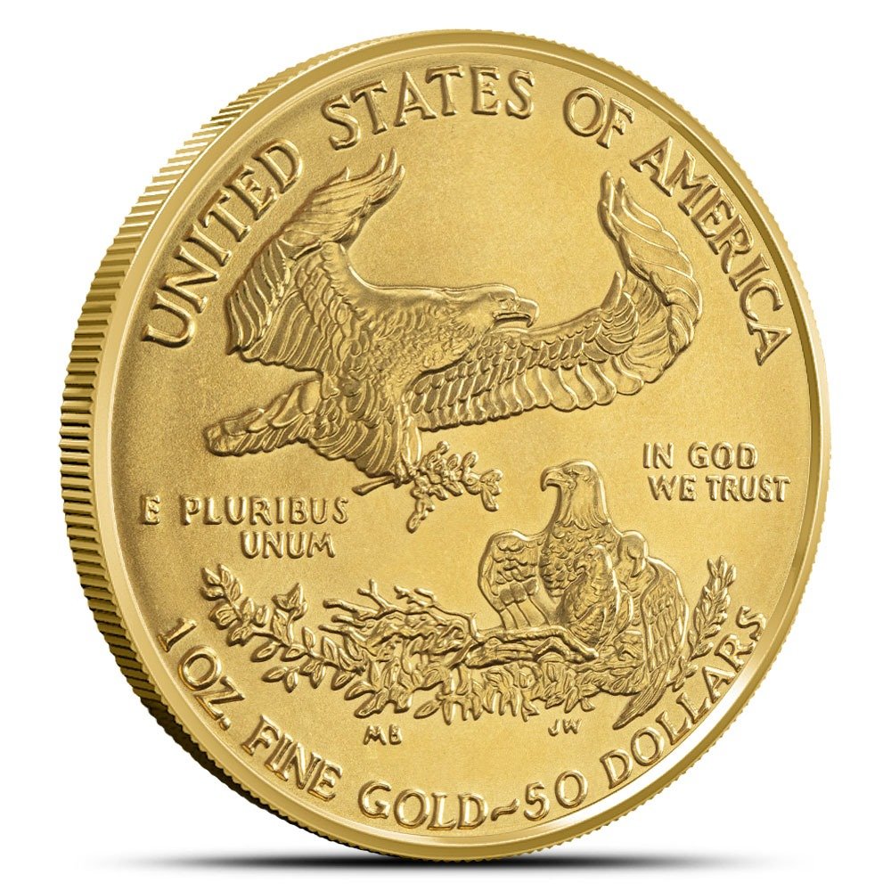 The reverse of all American Gold Eagle coins includes the design of a family of bald eagles in their nest. Created in 1986 by Miley Busiek, it features the image of a male eagle flying over the family nest, which contains a group of hatchlings that is guarded by a watchful female.