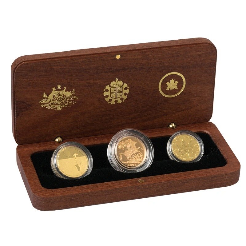 The exclusive set features the signature gold coins of each nation including: the Royal Australian Mint’s 1/5 oz 24 ct Kangaroo at Sunset; the Royal Mints 1/4 oz 22ct St George Sovereign; and the Royal Canadian Mint’s 1/4 oz 24 ct Gold Maple Leaf.