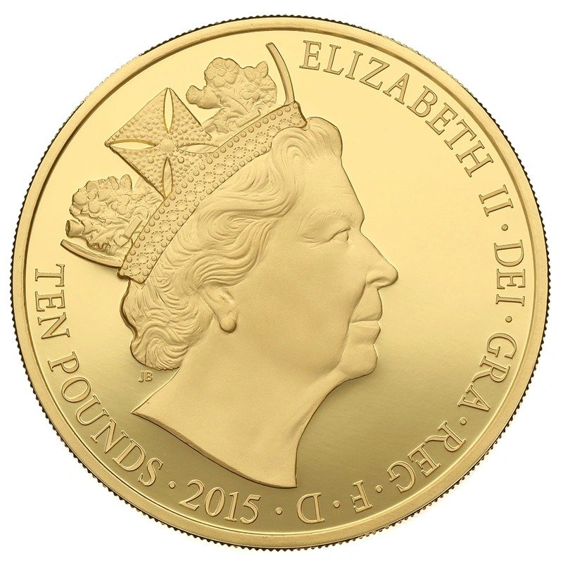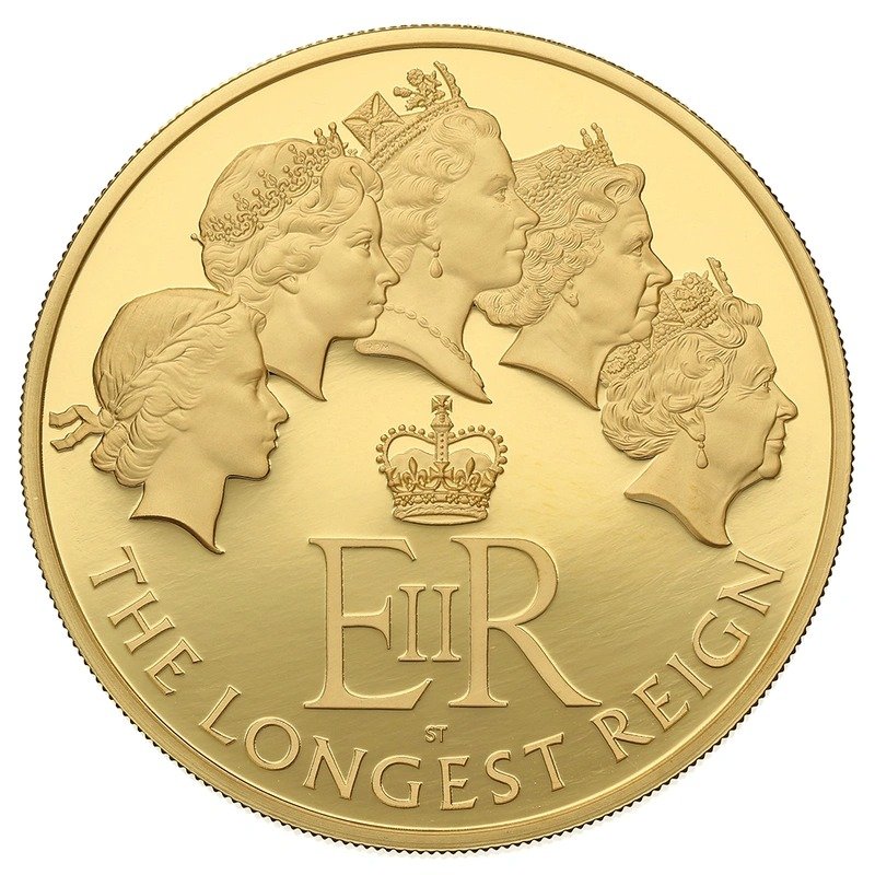 This 5oz £10 Pound Gold Proof coin, issued in 2015, celebrates Queen Elizabeth II achieving the record of longest reigning Monarch – surpassing the previous record held by Queen Victoria.