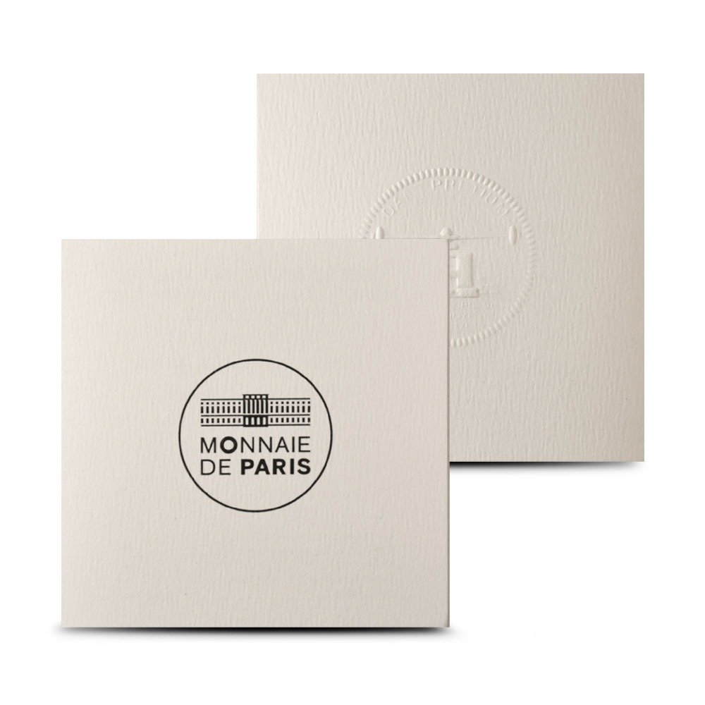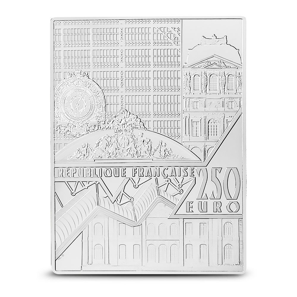 The obverse of the 2022 Proof French Silver The Water Lily Pond Coin comes with the identifying hallmarks of the piece, as well as several structures. Each of the buildings featured in the design field represents a different museum in France.
