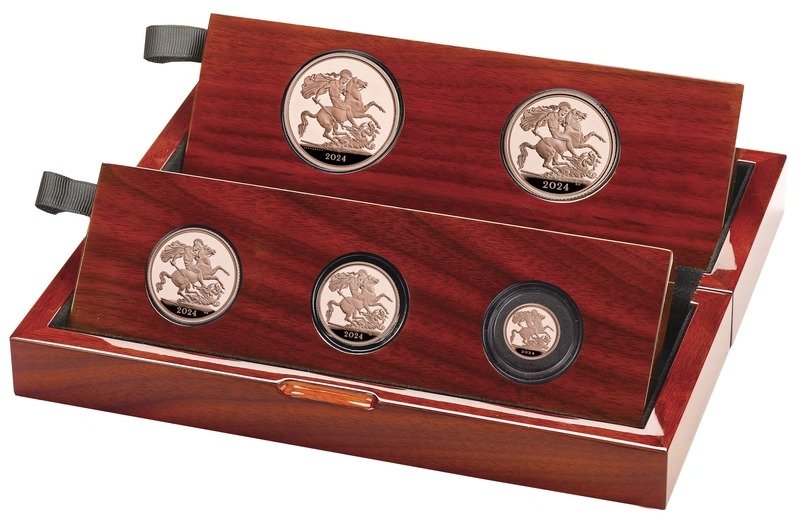 The 2024 Proof Sovereign five-coin set from The Royal Mint. Supplied in a beautiful presentation box with certificate of authenticity. The set contains the full range of coins with a Five Sovereign, Double Sovereign, Full Sovereign, Half Sovereign and Quarter Sovereign.